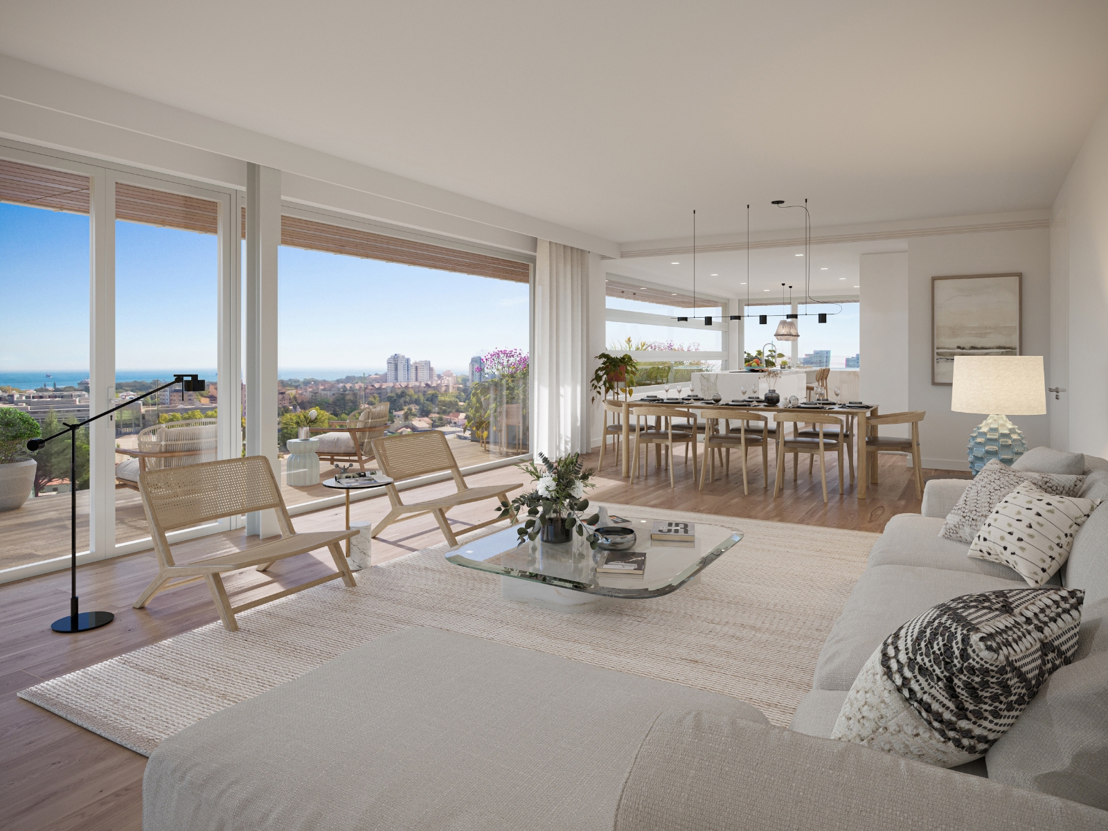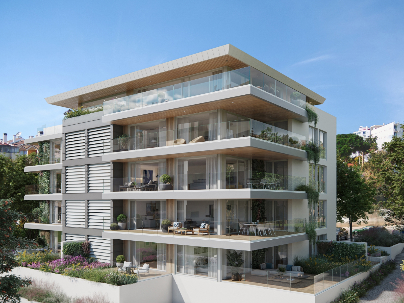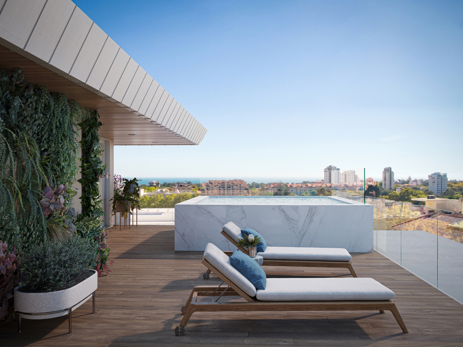 Cascais Terraces is an elegant 12-apartment residence, ranging from 2 to 5 rooms, characterized by its private terraces and spacious outdoor areas, some offering sea views. Designed to accommodate various lifestyles, it appeals to both young couples and families seeking space and comfort. Most outdoor spaces are covered and feature Deck wood flooring, perfect for relaxing or enjoying meals al fresco. The carefully landscaped gardens provide freshness, beauty, and privacy in perfect harmony with nature.